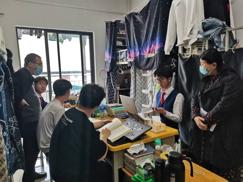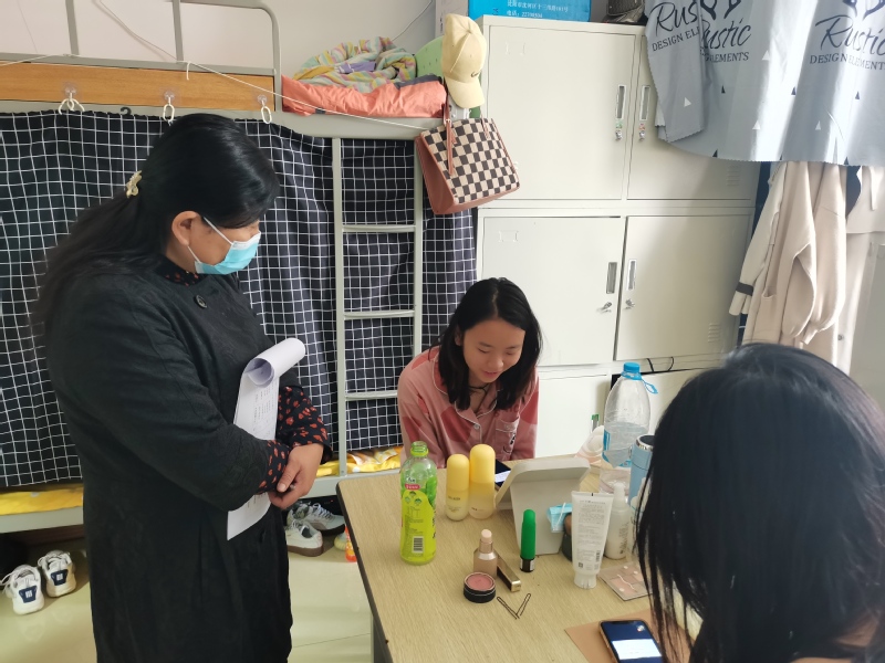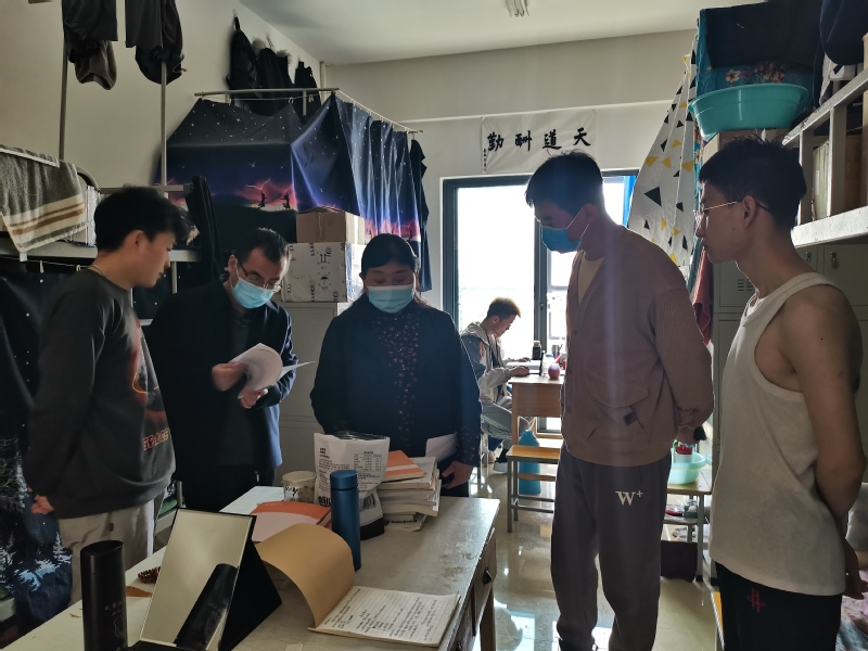 高亚芳院长叮嘱同学们严格遵守疫情防控规定,认真学习,尤其是寝室在疫情防控期间的规定。陶雪松副院长问询了同学们疫情期间上网课情况以及作息时间的调整,查看了学生们的笔记,提出在整理寝室内务的基础上,进一步规范整理的要求,并要求各寝室长落实。