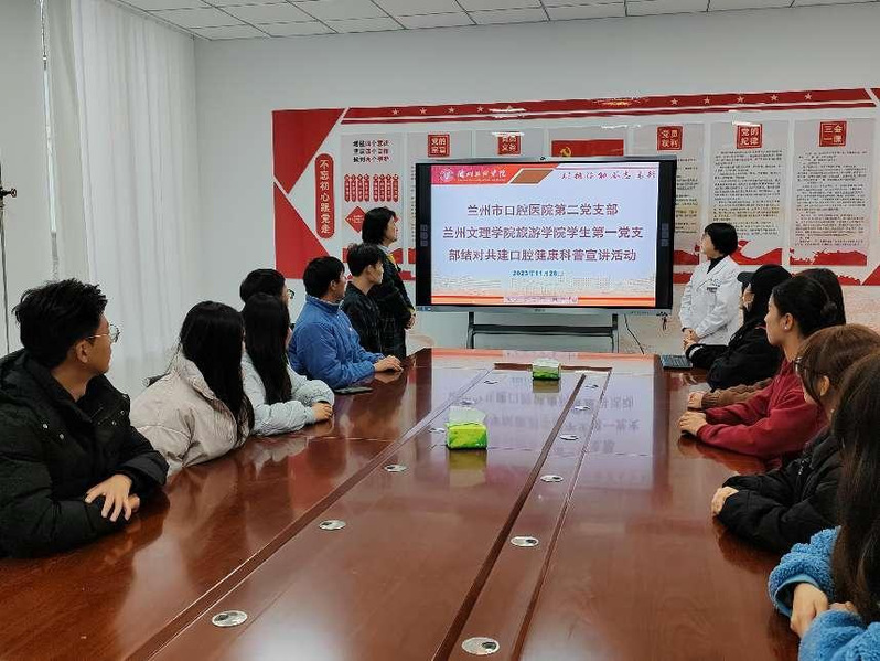 11月28日,在兰州文理学院老干部活动中心,以“科普知识进校园”为载体,兰州市口腔医院第二党支部与bat365官网登录入口学生第一党支部共聚一堂,在兰州文理学院机关党总支书记王金平的主持下,结对共建开展了“口腔健康科普”宣讲活动。