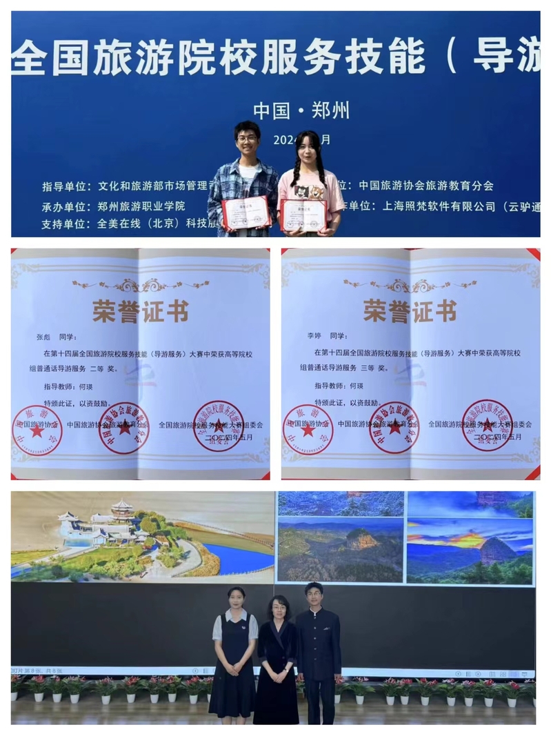在本次比赛中,何瑛教授指导的张彪和李婷两位同学,展现了扎实的专业知识、良好的职业素养和出色的应变能力。他们凭借扎实的理论知识,生动的导游词讲解、灵活的现场应变能力,以及精彩的才艺展示,赢得了评委和观众的一致好评。经过激烈的角逐,最终张彪同学荣获全国二等奖,李婷同学荣获全国三等奖。